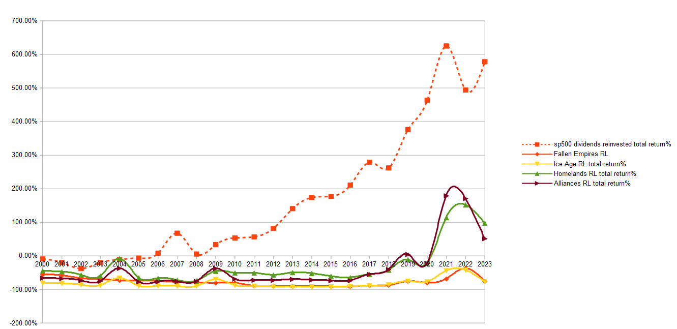 The only relevant thing to notice here is how the Index just destroyed this completely and utterly right up to the 2016 mark where some of the prices of the more desirable / rare / expensive cards from this category skyrocket.