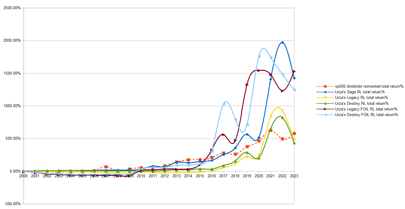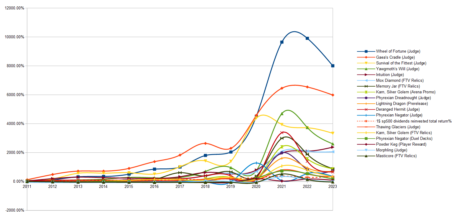 The judge promos did ludicrously well here, with many listed at 20-40$ in 2009 and going up to 1000-2600$ in 2023. Similar story for the Urza block foils.
